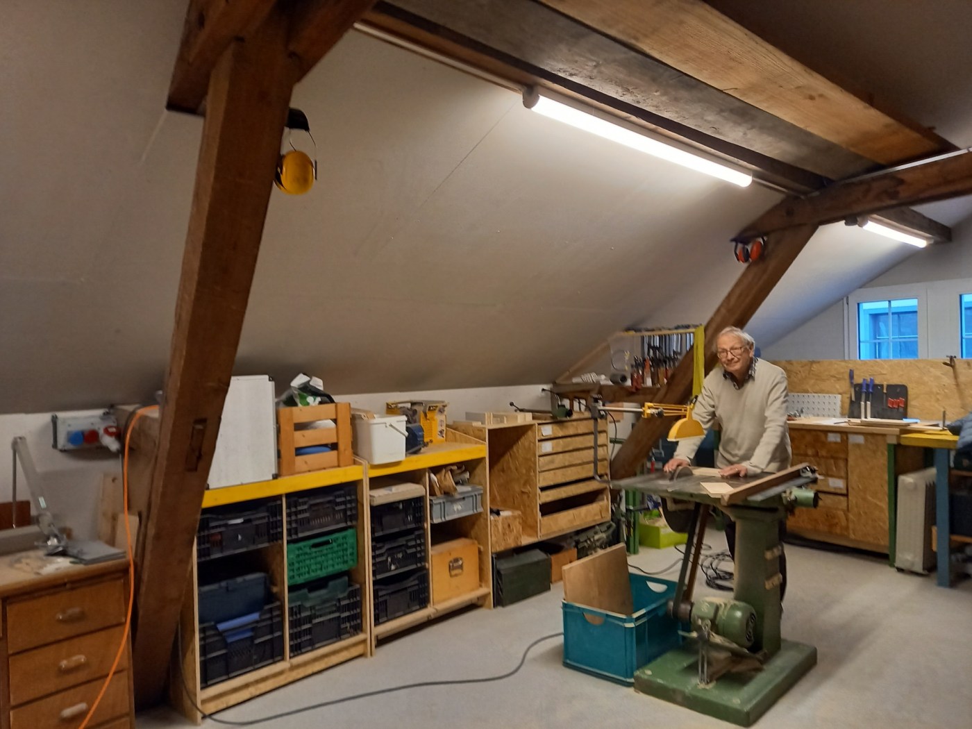 Ich staune, was es hier auf sechzig Quadratmetern alles an Geräten, Maschinen sowie an Schrauben und Nägeln aller Art gibt. Zum Beispiel eine Tischkreissäge mit 480-Volt-Motor, eine kleine Säge fürs „Laubsägeln“, einen Bohrer für Holz und Metall. Auch eine Hobelbank und selbst eine Kaffeemaschine fehlen nicht. „Hier kann man auch töpfern oder malen,“ betont Hansjörg, und die Remise werde für eine kleine Miete auch den Kunstschaffenden des Hauses sowie „Auswärtigen“ überlassen.