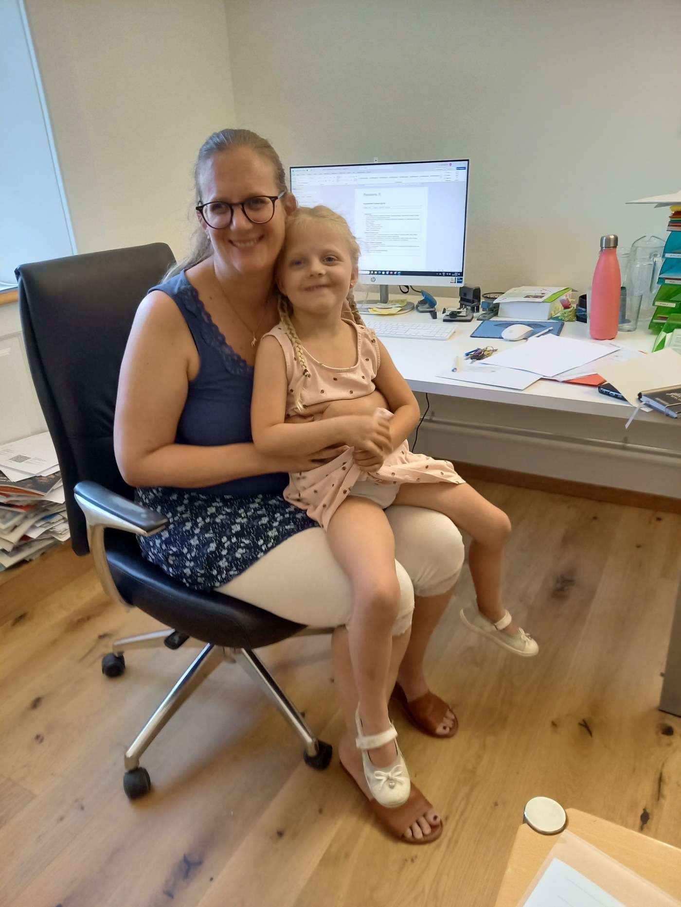 Bildlegende: Tonia Raich mit ihrer Jüngsten, Anika, die in den Sommerferien mit ins Büro darf.